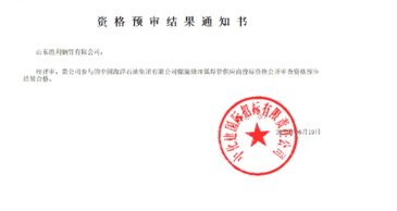 ? 2023年6月19日,山東勝利鋼管有限公司收到中化建國際招標(biāo)責(zé)任有限公司書面通知: “山東勝利鋼管有限公司:經(jīng)評審,貴公司參與的中國海洋石油集團(tuán)有限公司螺旋縫埋弧焊管供應(yīng)商投標(biāo)資格公開審查資格預(yù)審結(jié)果合格?!?/span> 這表明,山東勝利成功入圍中國海洋石油集團(tuán)有限公司的優(yōu)選供應(yīng)商,近三年內(nèi),公司將具備參與中海油螺旋縫埋弧焊管的投標(biāo)資格。2023年3月24日,中國海洋石油集團(tuán)有限公司發(fā)出招標(biāo)公告,就中國海洋石油集團(tuán)有限公司螺旋縫埋弧焊管供應(yīng)商投標(biāo)資格公開審查進(jìn)行國內(nèi)公開招標(biāo)。我公司積極報名參與投標(biāo),經(jīng)過精心準(zhǔn)備,于2023年4月7日遞交了資格預(yù)審文件。本次資格審查采用有限數(shù)量制,評審方法使用綜合評審法。審查委員會按資格預(yù)審文件所附評分標(biāo)準(zhǔn)進(jìn)行打分,在總得分高于75分的申請人中,按照得分排名由高到低的順序選擇前9家(不足9家時全部選取),形成候選申請人名單,進(jìn)行現(xiàn)場考察。 資格預(yù)審文件評審結(jié)果我公司排名靠前,順利進(jìn)入到現(xiàn)場考察階段。2023年5月19日,中國海洋石油集團(tuán)有限公司考察團(tuán)對我公司進(jìn)行了現(xiàn)場考察。 現(xiàn)場考察采用否決制,對資格預(yù)審申請文件內(nèi)容的真實(shí)性進(jìn)行逐項(xiàng)審核。考察團(tuán)重點(diǎn)考察了設(shè)備情況、提供證明文件的真實(shí)性及大管線生產(chǎn)記錄。公司各部門精誠合作,積極配合現(xiàn)場考察工作,現(xiàn)場考察順利通過,沒有任何問題,考察團(tuán)對我公司高度認(rèn)可。我公司成功通過中國海洋石油集團(tuán)有限公司供應(yīng)商的書面評審及現(xiàn)場考察,為成功進(jìn)入中國海洋石油集團(tuán)有限公司的優(yōu)選供應(yīng)商奠定了堅實(shí)的基礎(chǔ)。