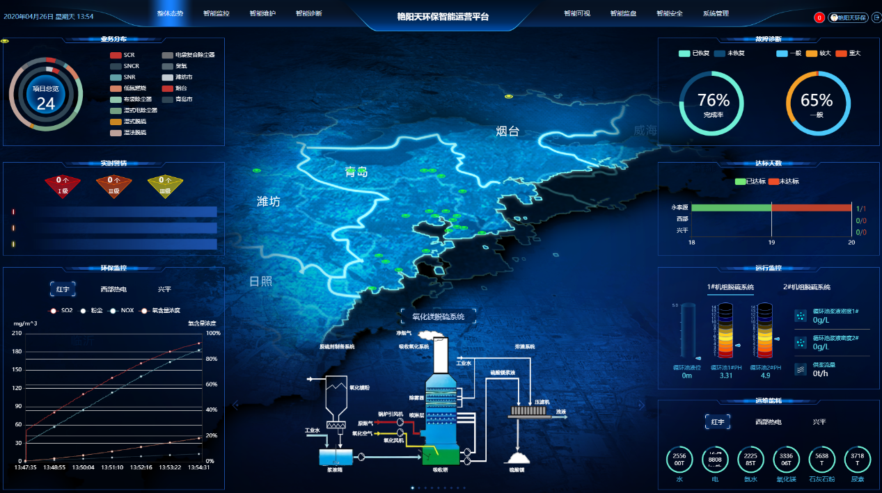 艷陽天環(huán)??萍脊局悄墉h(huán)保運(yùn)營平臺,采集并長期存儲生產(chǎn)過程實(shí)時(shí)數(shù)據(jù),建立了縱向、橫向比較的生產(chǎn)信息平臺,實(shí)現(xiàn)云平臺、大數(shù)據(jù)分析、物聯(lián)網(wǎng)、移動終端、人工智能集一體的智能運(yùn)營平臺。生產(chǎn)信息系統(tǒng)的性能計(jì)算與分析、故障診斷等功能為優(yōu)化機(jī)組環(huán)保設(shè)施運(yùn)行提供技術(shù)支持。管理信息系統(tǒng)對電廠的設(shè)備狀態(tài)信息、檢維修過程信息等數(shù)據(jù)進(jìn)行整合挖掘和智能分析,實(shí)現(xiàn)“智能運(yùn)行、預(yù)知維護(hù)、安全管控、節(jié)能降耗”