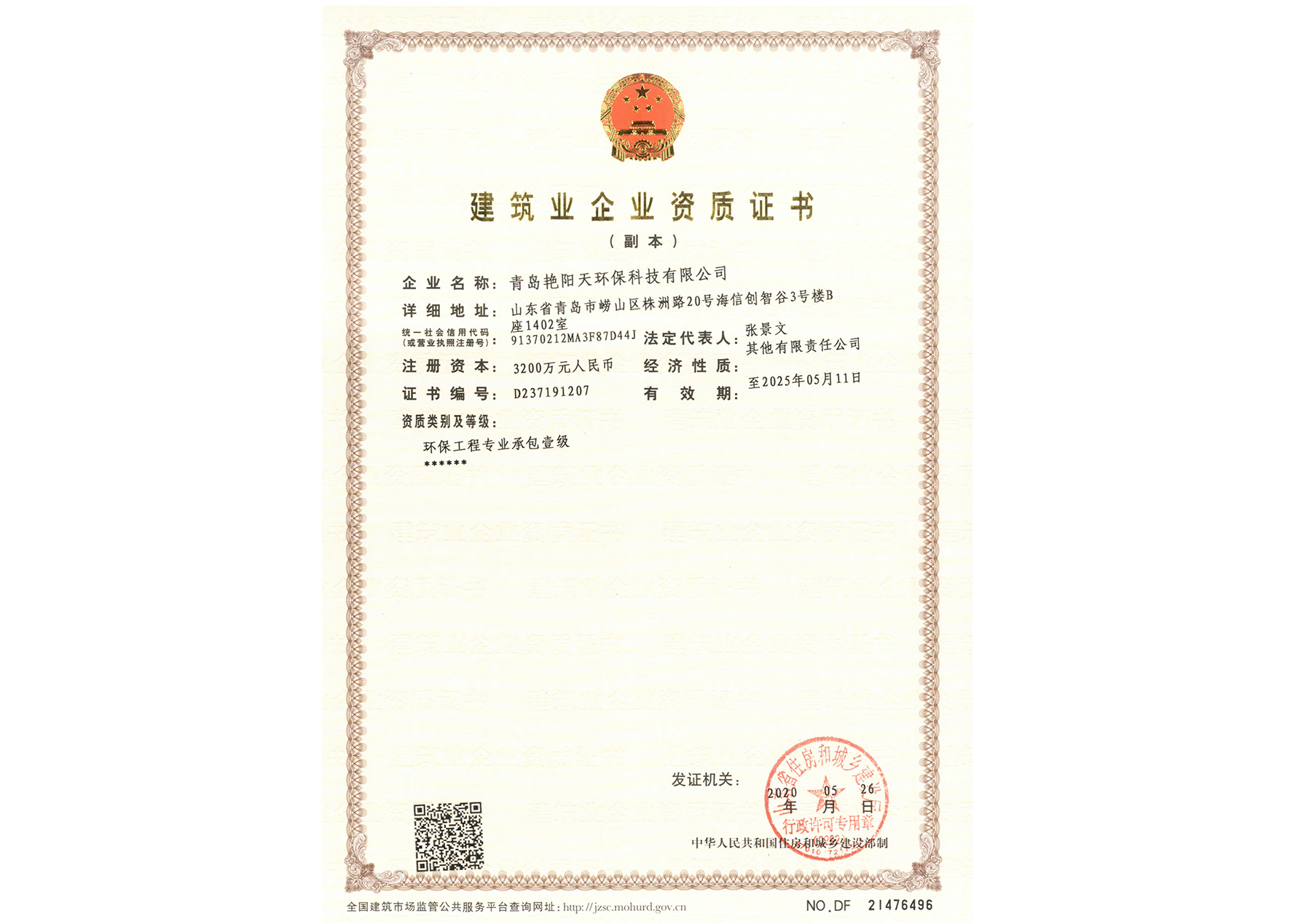 2020年5月11日,公司資質(zhì)升級(jí)工作再傳佳音。經(jīng)主管部門審核,公司申報(bào)的環(huán)保工程專業(yè)承包壹級(jí)資質(zhì)成功獲批,新資質(zhì)的取得將使公司環(huán)境工程承攬業(yè)務(wù)不再受限,對(duì)提高公司市場(chǎng)競(jìng)爭(zhēng)力意義重大。