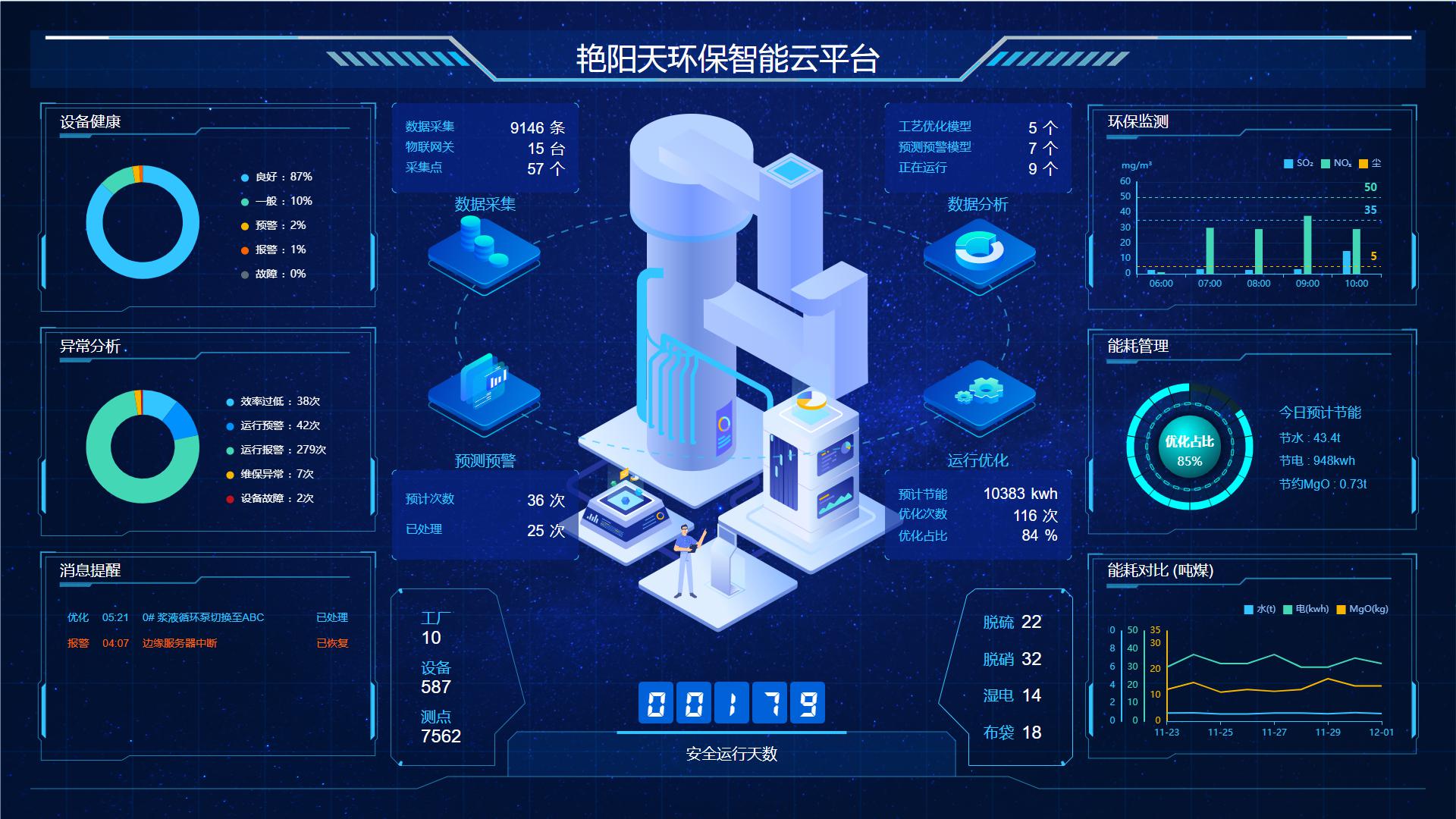 不同于政府的監(jiān)管平臺,艷陽天環(huán)保智能云平臺的主要目的就是為熱電企業(yè)的環(huán)保島生產(chǎn)運營提供服務(wù)。一方面通過大數(shù)據(jù)分析總結(jié)固化運行經(jīng)驗,保證煙氣“穩(wěn)定達標排放”,實現(xiàn)環(huán)保設(shè)施運營的安全性;另一方面通過最優(yōu)工況對比分析,“節(jié)能降耗”,實現(xiàn)運營的經(jīng)濟性;此外,通過“設(shè)備健康狀況”的診斷,還可以減少意外停機和不必要的檢修,實現(xiàn)運營的高效性。